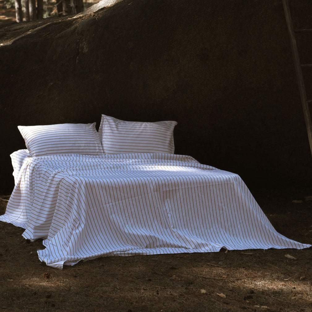 Our sateen weave is one vertical thread woven for every four horizontal threads. This type of weave produces a fabric with a lustrous look and soft feel. Made from a very fine yarn, we weave the fabric freshly for each of our collections and drops, guaranteeing you the best cotton sheets you've ever slept in.